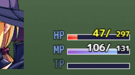 ゲージ描画を拡張します。 ・ゲージ枠、立体感を付ける ・ゲージ色をプラグインパラメータで変更 ・ゲージ高さを変更 ・残り少なくなったら赤く点滅させる ・HP・MPの最大値を表示